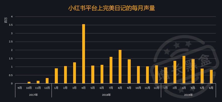 我们先来考察下声量的变化(即笔记留言+点赞+收藏的总量),因为投放的效果直接反应到声量上 - 而通过不同时期声量的差异变化,则能够推断其投放行为的规律。数据显示,完美日记在每年3-4月、8-9月的声量有明显的增长。