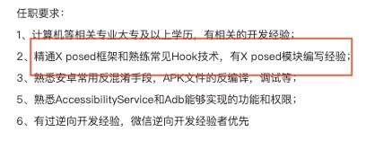 同样,从完美日记的招聘信息中就可以找到线索:比如“安卓开发工程师”这个岗位,任职要求中提到的Xpose技术,它最广泛的应用便是“微信群控”。而文中提到的逆向开发,更是建立群控系统的基础。