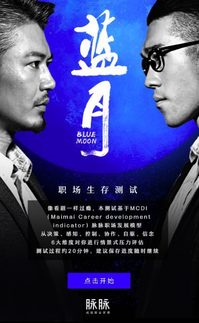 就好像玩RPG游戏的体验一样,不同选择决定不同结局。据脉脉官方统计,《蓝月》共38种互动结局,测评的职场人格是基于MCDI脉脉职场发展模型6大因素(决策、感知、控制、协作、自驱、信念)的240种组合。另外,诸多触发用户行动的细节设置,也值五星好评。