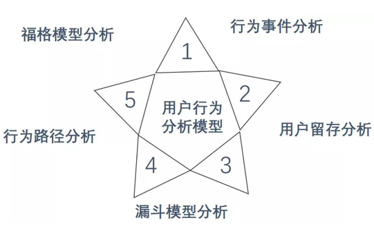 确定好用户行为分析指标后,我们可以借助一些模型对用户行为的数据进行定性和定量的分析。常用的分析模型有:行为事件分析、用户留存分析、漏斗模型分析、行为路径分析和福格模型分析,如图3.3-4所示。