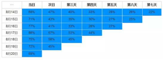 用户留存一般符合40-20-10法则,即新用户的次日留存应该大于40%,周留存大于20%,月留存大于10%才符合业务标准。我们做用户留存分析主要验证是否达到既定的运营目标,进而影响下一步的产品决策。