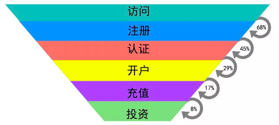 以邀请投资的漏斗模型为例,如图3.3-7所示。邀请人将活动专题页分享给好友,之后进行的注册、认证、开户、充值到投资,用漏斗模型分析一些关键节点的转化率。其中用户注册转化率为68%,实名认证转化率为45%,绑卡开户转化率为29%,线上充值转化率为17%,投资标的转化率为8%。