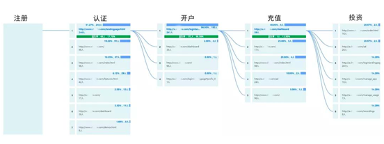以用户投标的行为路径为例,如图3.3-8所示。我们可以记录用户从注册、认证、开户、充值到投资的行为轨迹。通过分析用户的这些行为轨迹数据,来验证访问路径是否和预期指标的一致。