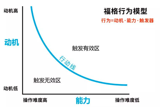 福格行为模型是用来研究用户行为原因的分析模型,如图3.3-9所示。福格行为模型用公式来简化就是B=MAT,即B=MAT。B代表行为,M代表动机,A代表能力,T代表触发。它认为要让一个行为发生,必须同时具备三个元素:动机、能力和触发器。因此可以借助福格行为模型来评估产品的合理性和能否达到预期目标。