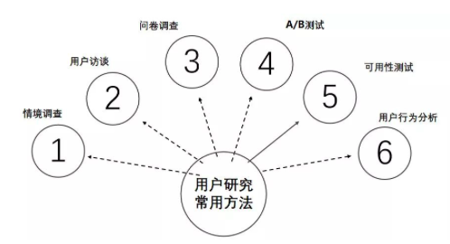 用户研究的常用方法有:情境调查、用户访谈、问卷调查、A/B测试、可用性测试与用户行为分析,如图3.3-1所示。其中用户行为分析是用户研究的最有效方法之一。
