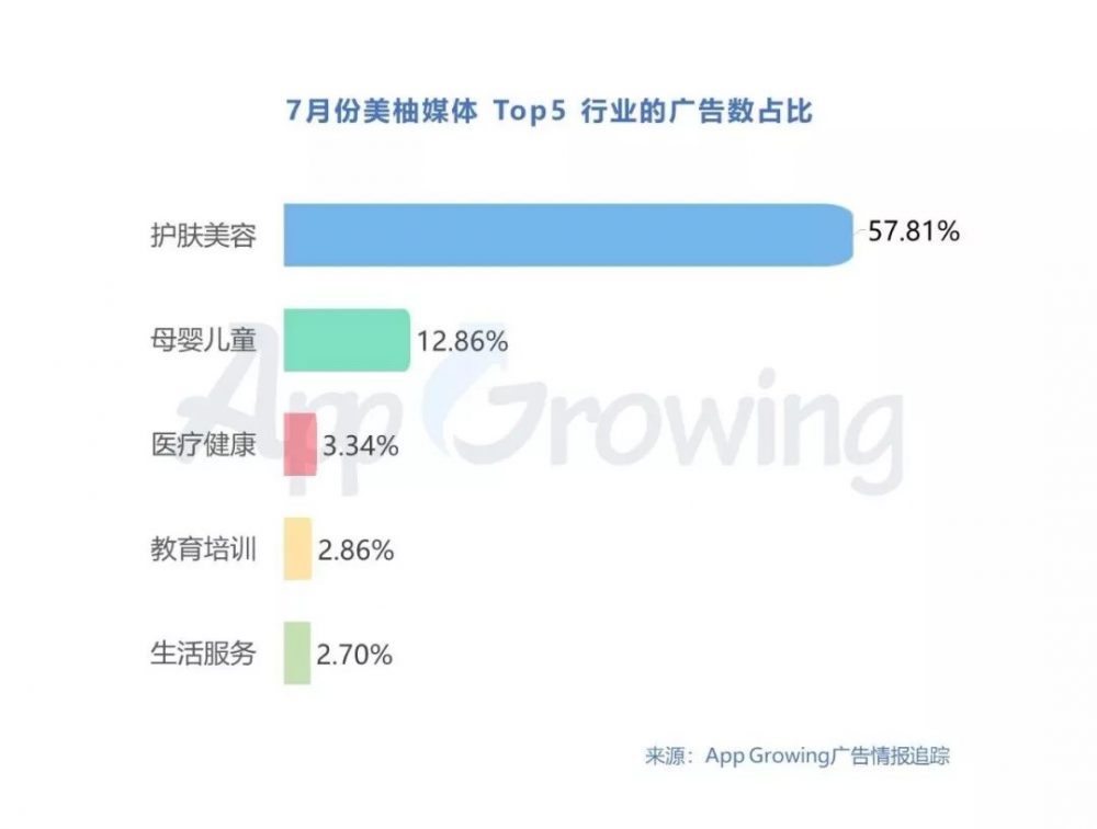 美柚媒体8月份广告投放数占比Top5行业中,护肤美容、母婴儿童和医疗健康的广告投放数分列前三,其中护肤美容占比最大,达到57.81%。