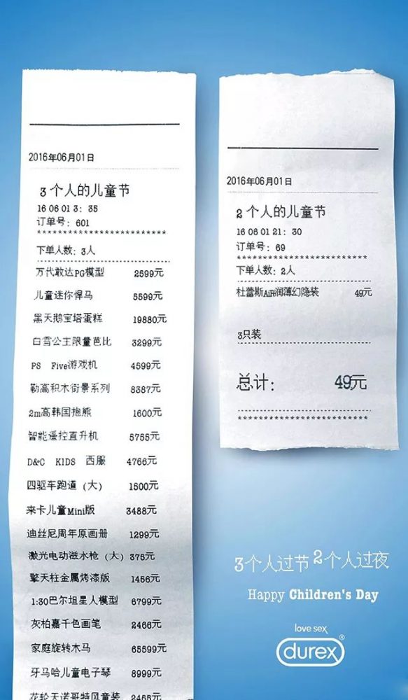 比如杜蕾斯的玩法就相当高明。在六一儿童节的时候,杜蕾斯推出一个“3个人的儿童节和2个人的儿童节”海报。