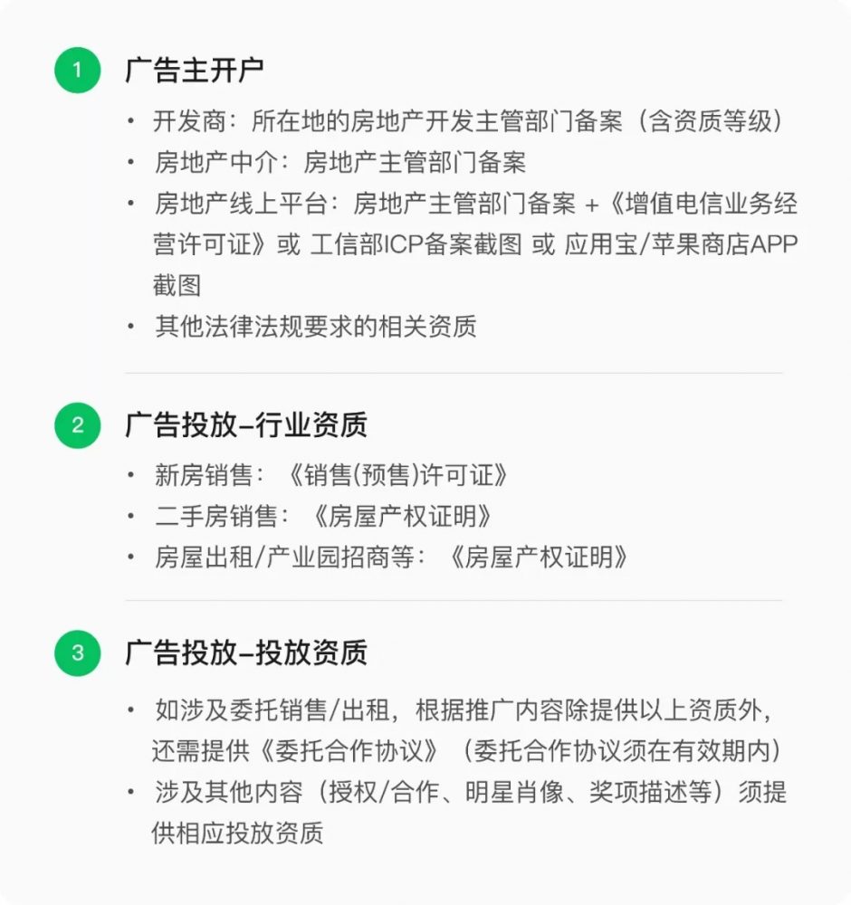 3.房产行业特有资质(房屋产权证、销售/预售许可证等)提交至行业资质,其他通用的广告资质(授权/合作协议、肖像权、奖项证明文件等)提交至投放资质