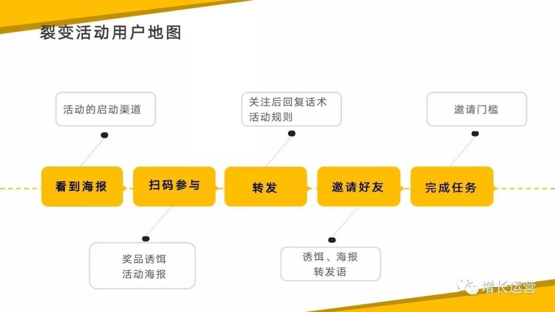确定了核心目标,站在用户的角度:一个用户从对你一无所知到成为你公众号里的一个关注用户,需要经历哪些步骤?把这些步骤依次罗列,组成了裂变活动的用户地图: