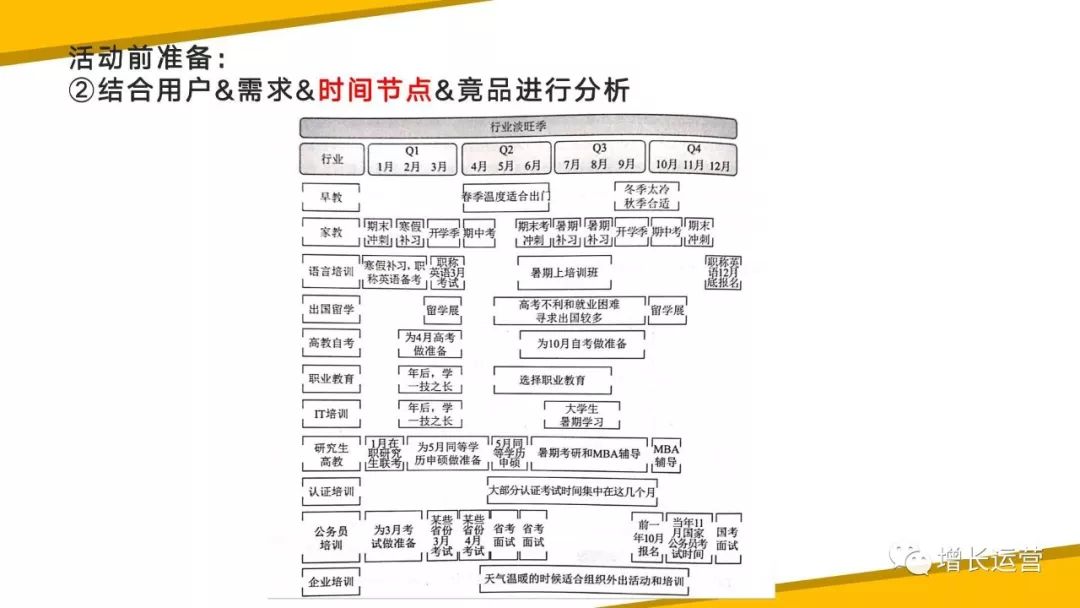 上面这张图是教育行业对应的各个时间节点。利用这张图上的信息再结合节假日,你就基本可以了解各个时间段需要准备哪些活动。比如现在到了九月份,大家就可以围绕开学季去策划活动。开学季之后依次是教师节、中秋节、国庆节和期中考试。