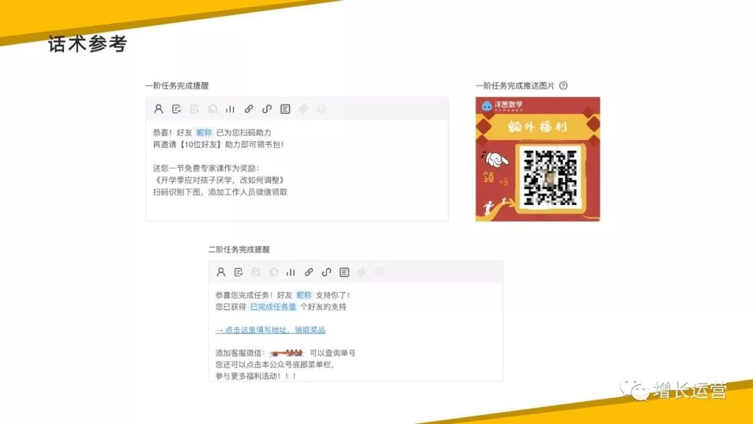 当然我们也可以把上面说到的两种策略合并到同一个活动中来做。可看参考上图中给到的话术内容。这里面,一阶任务完成以后引导用户加个人号领取课程,二阶任务完成后引导用户添加个人号查询快递单号。