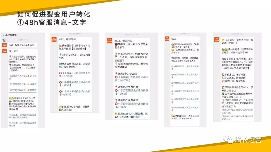 提前设置编辑好文案和时间之后,一旦有新用户关注,就会陆续的收到消息,引导用户了解产品,购买课程,参加低价练营活动或者参加其他裂变活动。