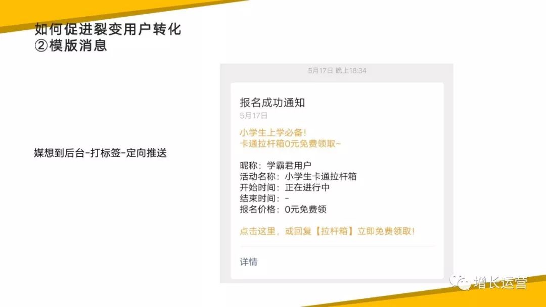 另外,筛选出所有未获奖的用户打上标签,推送模版消息提醒活动即将结束,也能够促进用户邀请。对于已经完成任务的用户,打标签推送模版消息提醒他参加排行榜领取更高的奖励。