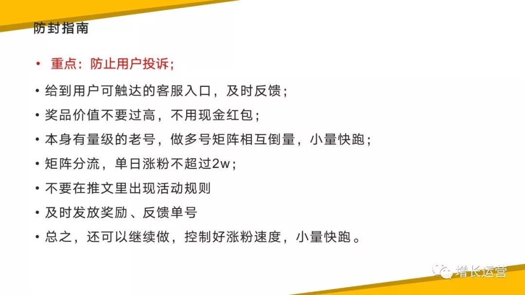活动进行中,随时留意公众号的增长情况,防止增长过快,超过阈值。尽量使用矩阵分流,多公众号矩阵的分流裂变,日涨粉控制在10w以内都是安全的。