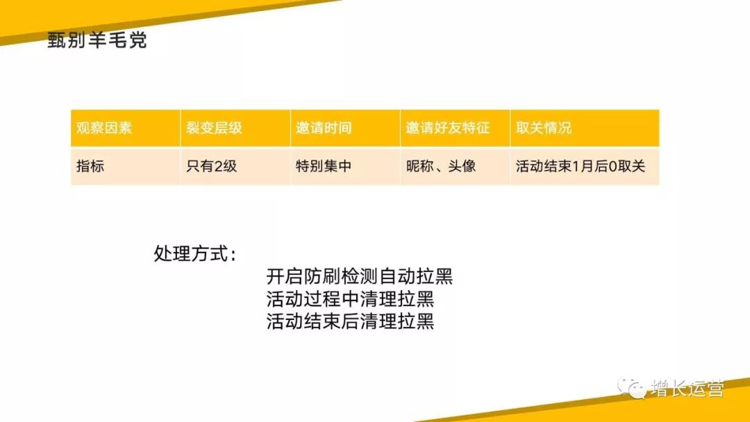 当你看到一个用户只有2级邀请层级,邀请好友的时间比较集中,邀请到的好友微信名字和头像都比较接近。且1个月后无1人取关,此时你就可以考虑拉黑这个用户让他无法参加后续的活动来避免羊毛党了。