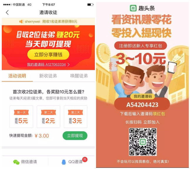 趣头条的迅猛崛起,亦是得益于它的现金奖励制度。注册现金奖励、拉人有红包、发展下线上线有现金奖励等等这些实现了获客,按阅读时长又有现金奖励则巩固了留存。下沉三杰之中,拼多多、快乐、趣头条,两大巨头都是得益于利益驱动下的社交裂变。足以显示趋利性的重要意义。越到下线市场越有效。