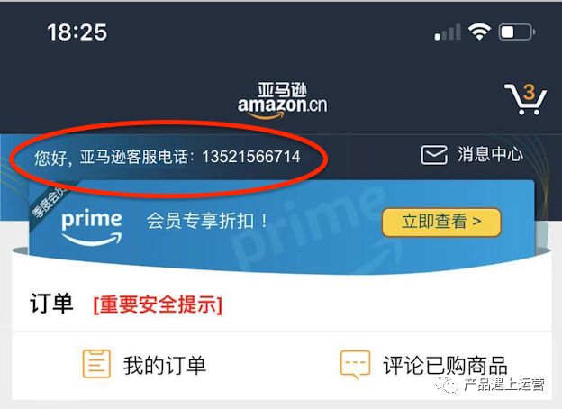 我非常惊讶,明明没有申请退货啊。于是我向该客服询问,该客服表示我可以看下系统是否误操作,稍后他再打过来。我挂了电话打开App看了看,那个订单确实处在“申请退货”的状态。同时,我看到在个人中心左上角欢迎语的地方,赫然显示着“亚马逊客服电话:13521566714”的字样,如下图。