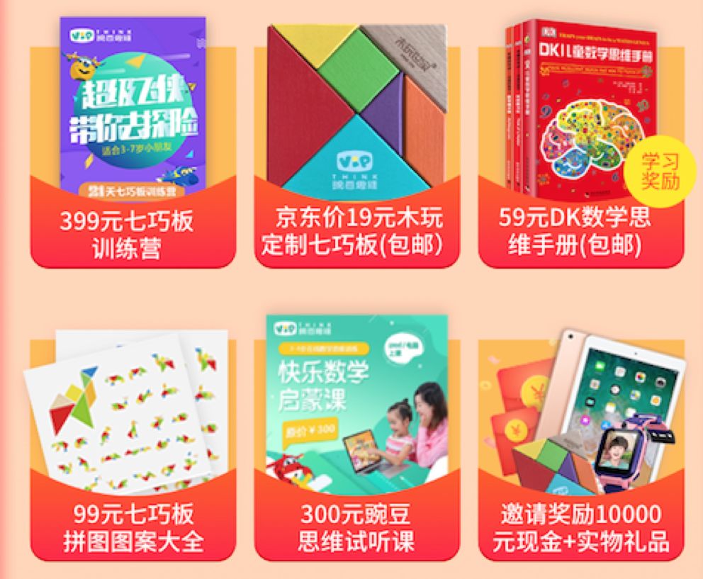 现有的21天七巧板学习课程,并联合木玩世家定制了专属的七巧板实物,针对豌豆的目标用户群,包装一个“课程+实物”的组合有爆款的潜质,通过设置低价课做分销裂变引流,将精准目标用户圈到自有平台,后面转化高客单价的模式,能实现低成本营收增长。