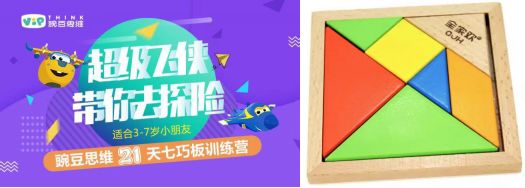 七巧板探险营的主题,受众人群广,简单轻松好玩,很多家庭给孩子买了七巧板,但没有玩起来,大家都只是听说能拼成1600个图案,怎么拼没人教不会玩。很少有专门讲七巧板的系列课程,市场较为空白,产品刚好满足这部分市场需求。