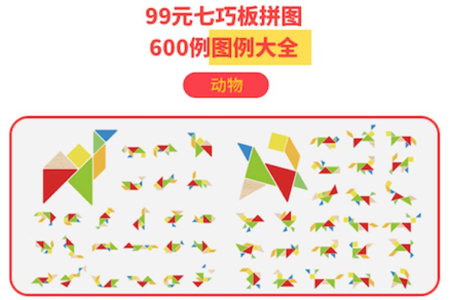 用户所需要的就是市场机会,七巧板加上课程、加上拼图,才能达到立体学习的效果。我们就应势加入了“600例拼图团案大全”的诱饵,用户很想要图例,600个看着也多,价值感就出来了。实际的效果也印证了我的判断,有些购买的用户中就是冲着拼图大全花的钱。