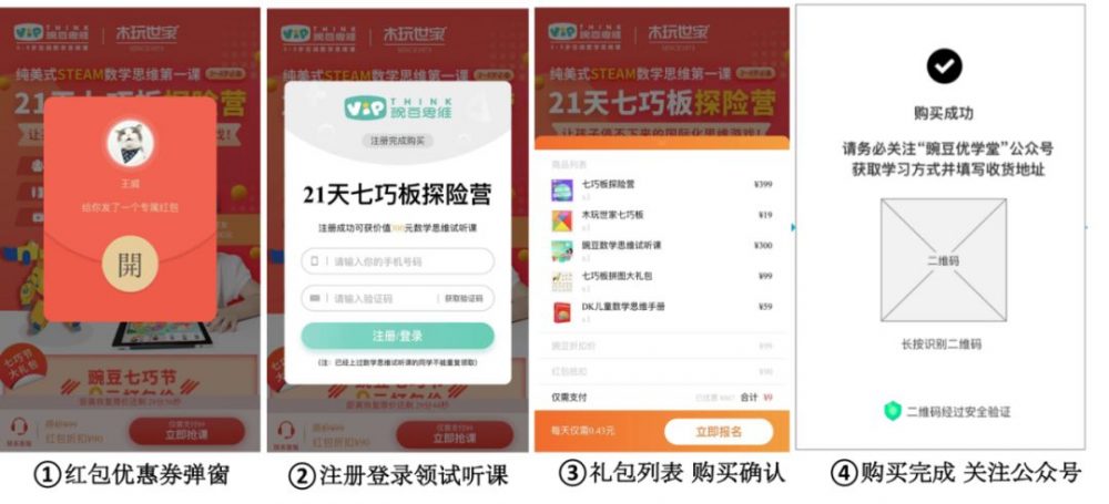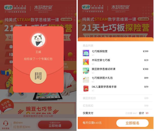 这次我们包装的大礼包,包含21天的七巧板课程、七巧板实物包邮、七巧板拼图大全、豌豆思维直播课、打卡还奖DK数学思维手册。这么便宜的的价格能买到很多东西,每个东西单拎出来都能值9元,一共才9元,每件商品一个个展开放,用户就会觉得非常超值,错过不买都觉得很亏,超预期的价值感知带来超高的转化率