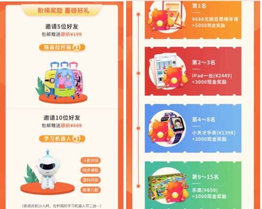 玩法:大礼包定价9元,用户可购买、可分销,邀请1个人购买得5元,邀请5个人送拉杆箱,邀请10个人送机器人,排行榜前1-15名有年课、现金、品牌实物