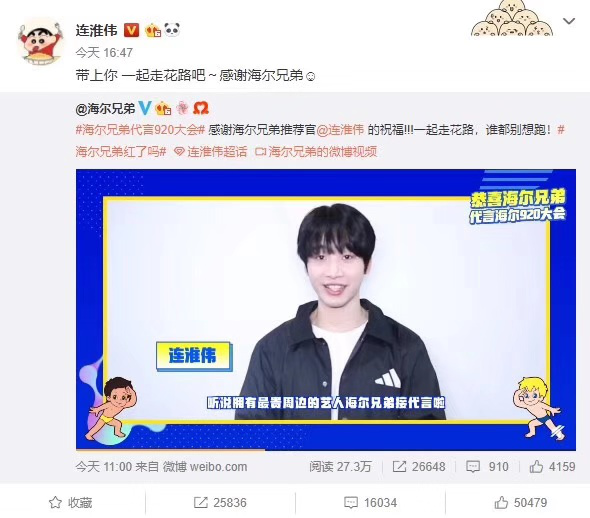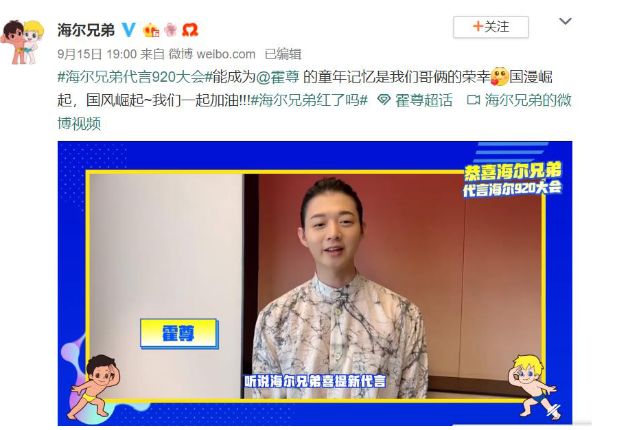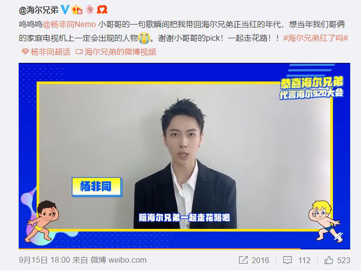 正是在这样的思路指引下,从去年8月出道,晒出由熊出没、流氓兔、阿狸、长草颜团子、穿越火线、永恒之塔等50组知名IP助阵的大合影,同时在#海尔兄弟出道#微博话题中收获无数打Call后,在之后的一年中,海尔兄弟与各路明星、IP一直是互动不断,娱乐圈“当红炸子鸡”称号可谓实至名归,
