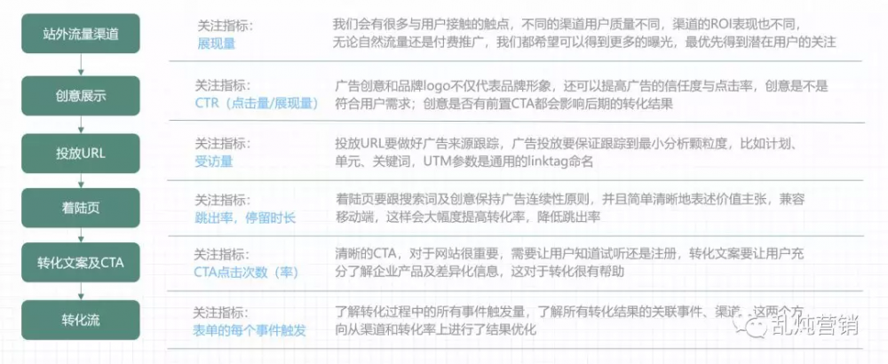 花钱的渠道因为每天都有真金白银拿出去,因此“截流”和“开源”同样重要,截流就是指各环节转化率的提升。从关键词的选择、创意设计,再到投放、着陆页和转化,每一步都需要根据数据结果的反馈去思考优化的方向,因此对于付费渠道管理的重要前提就是数据的可视化。要看哪些数据呢?搜索引擎的展现量,着陆页的用户跳出率和停留时长等等,各环节的数据并不是孤立的,数据与数据之间都有逻辑关系,到底哪里有优化的空间,就需要动态的测试优化。
