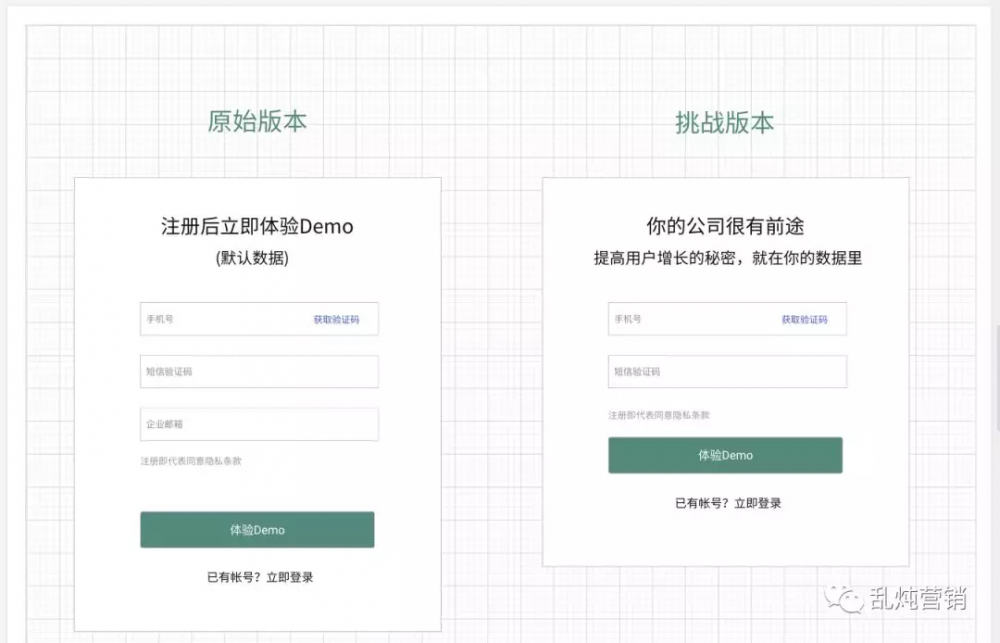 比如上图中的注册表单页面,同样的内容,当整个表单的字段数量和顺序一样时,测试结果显示:大部分人会更倾向于第二个版本。而优化时的考虑就是后者字段更少,降低客户留资的心理成本,同时文案更有代入感和情感。