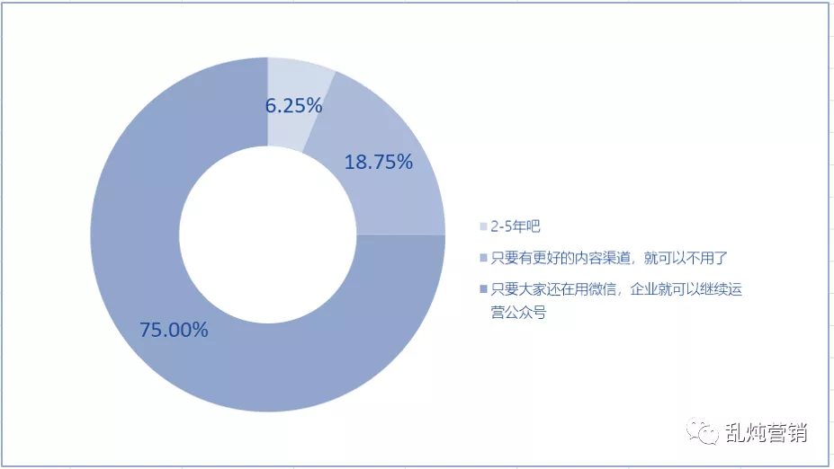 微信公众号现在的平均打开率远低于5%,很多自媒体对于微信的价值产生了焦虑甚至唱衰。但我们前段时间做了一个关于微信内容营销的小调研,在“微信运营还值得企业用多久”这个问题下,75%的小伙伴选择了“只要大家还在用微信,企业就可以继续运营公众号”;而到目前为止,不管是抖音还是快手、微博,亦或是ins或vlog,都还远未达到与微信分庭抗礼的阶段。所以微信对于B2B企业而言还有相当长的生命力。
