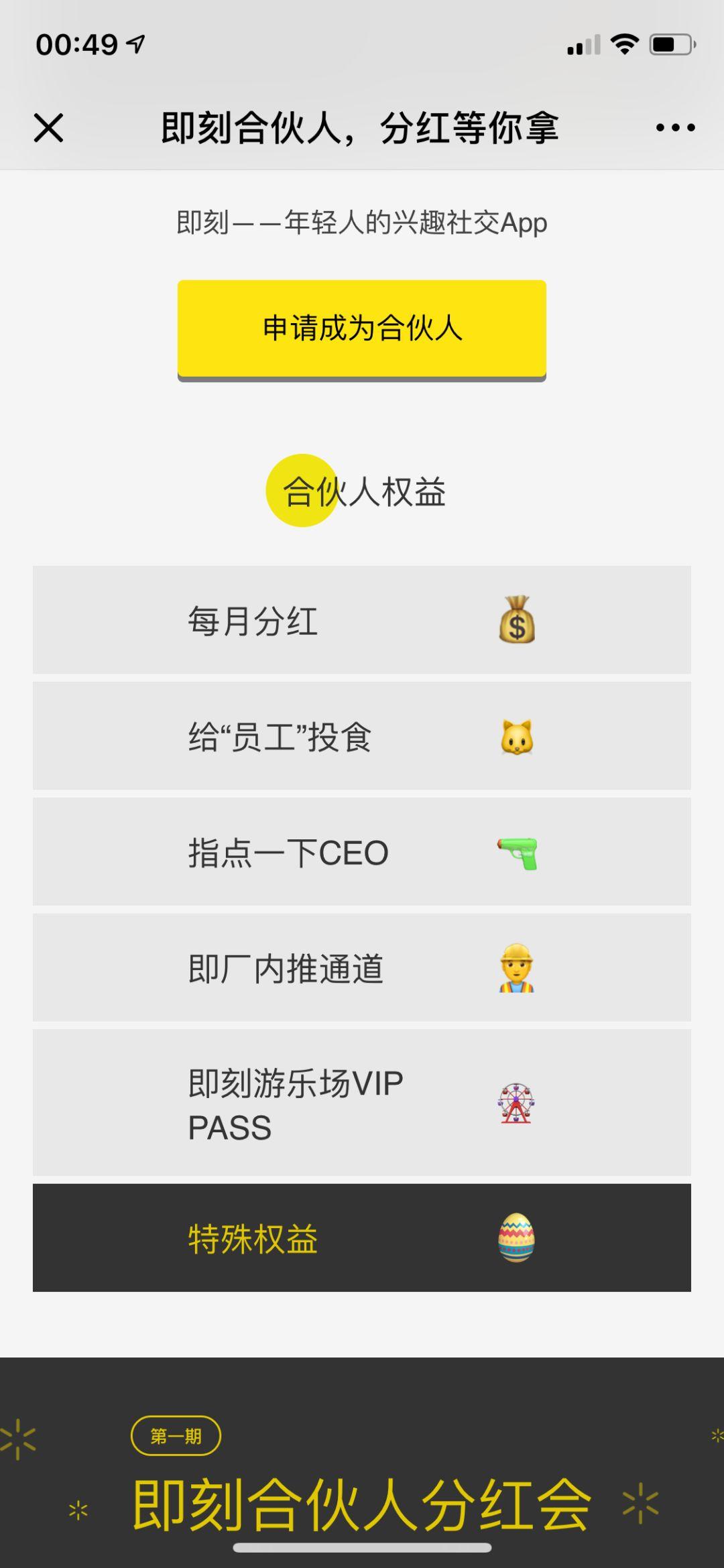 「合伙人权益」中讨巧的是,所有的权益里,只有分红是真正的利益点,剩余的四项包含了,公司文化(给“员工”投食)、反馈通道(指点CEO)、招聘信息(即厂内推)、以及社交福利(即刻游乐场),这四项都包装成了合伙人的权益,增加用户的获得感。