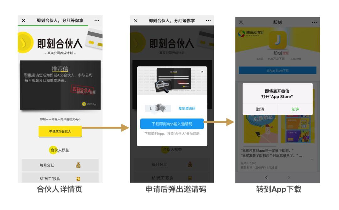 点击「申请成为合伙人」,顺利转化到用户下载即刻App,完成产品的拉新动作。