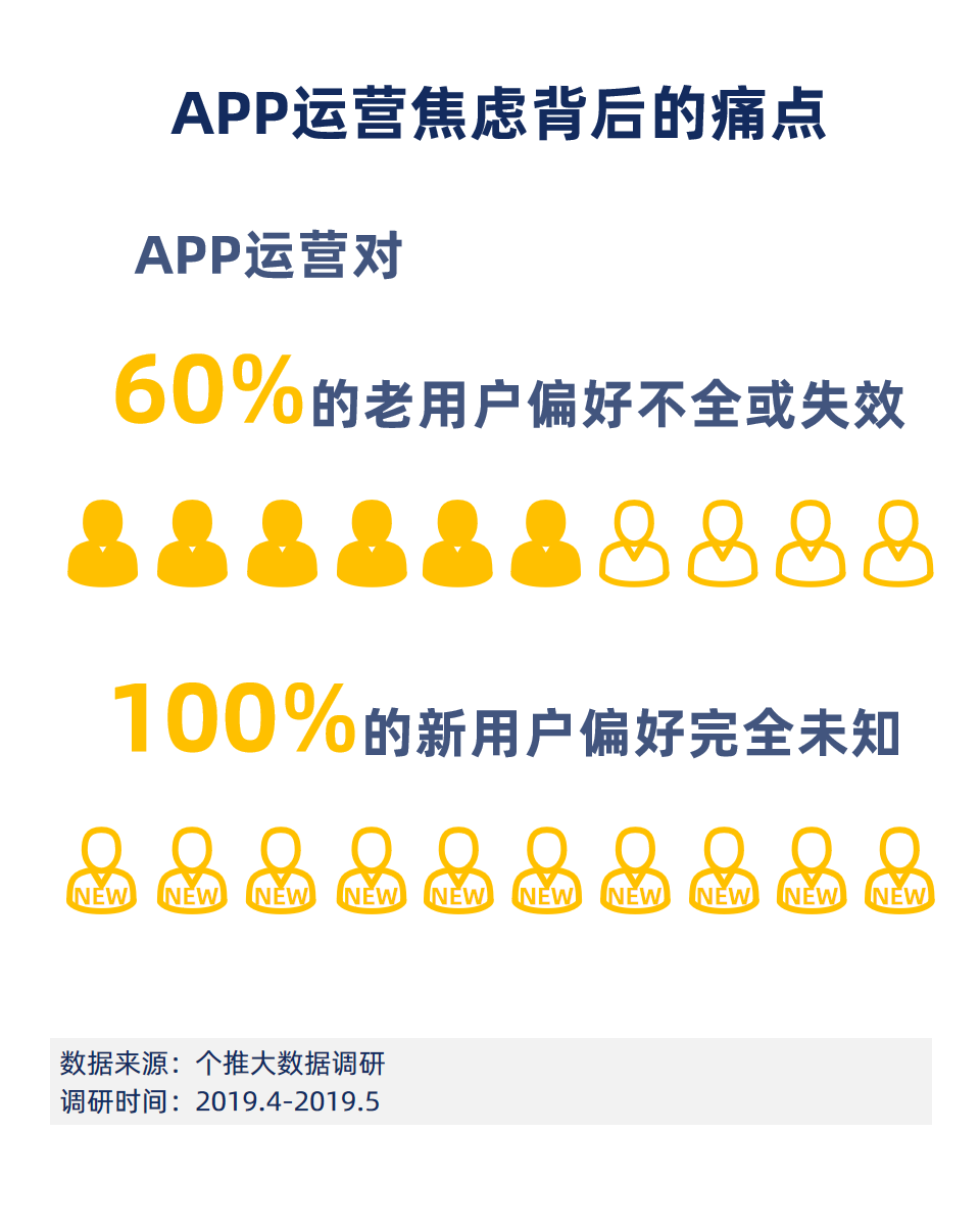 在数据洞察的基础上,我们还对部分APP运营做了调研。调研发现,大部分APP因用户画像的能力不足,制约了精细化用户运营的开展。比如:这些APP里约60%老用户的画像偏好不全或失效,同时对新注册不活跃用户偏好又完全未知。也就是说APP们并非不想开采这70%的用户资源,而是他们对这些非活跃用户缺乏了解,且没有好的途径和好的办法去了解。
