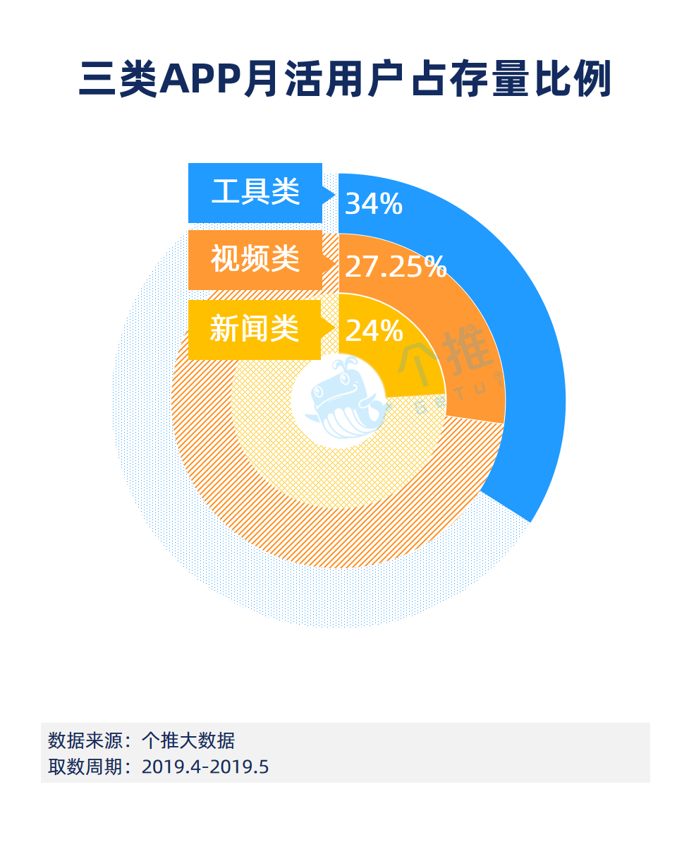 为了了解APP运营们的焦虑,我们对市面上资讯类、视频类、工具类等热门APP用户活跃情况进行大数据分析。分析结果显示,除了某些采用现金奖励进行用户裂变的APP月活用户占存量比例超过50%以外,三大主要类别APP月活用户占存量比例的平均值为27.8%。