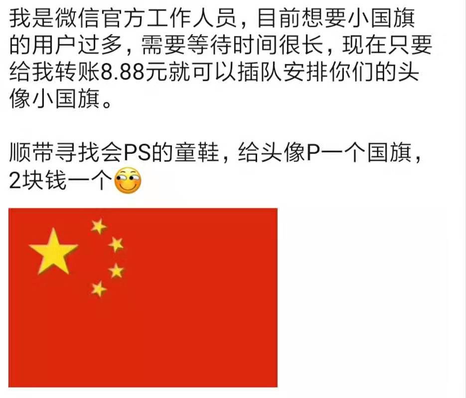 他们明知道这个消息是假的,但是依然会故意发圈求一面五星红旗,并且自己早已准备好了红旗的头像,配合朋友圈发送,当了一次演员,广而告之——@微信官方可以得一面五星红旗~