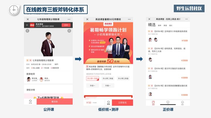 其次,通过大量免费课的清洗,会有部分意向用户涌现,此时推广50元直播课,以低价吸引这部分用户,并提供高频、集中、趋向高价课水平的内容及服务。