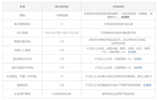 任务成长值=首次购物+评价+购物天数+完善个人信息+手机号绑定+支付密码+分享推荐