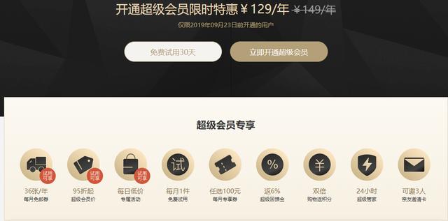 超级会员权益如下:免邮券、95折、专属低价、免费试用、双倍积分等。