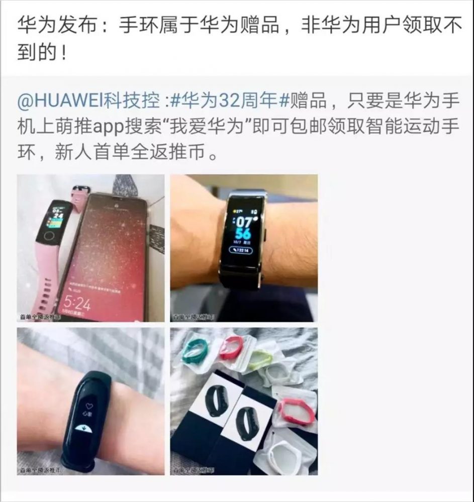 只要在华为手机「萌推」 App 搜索“我爱华为”即可包邮领取智能运动手环……