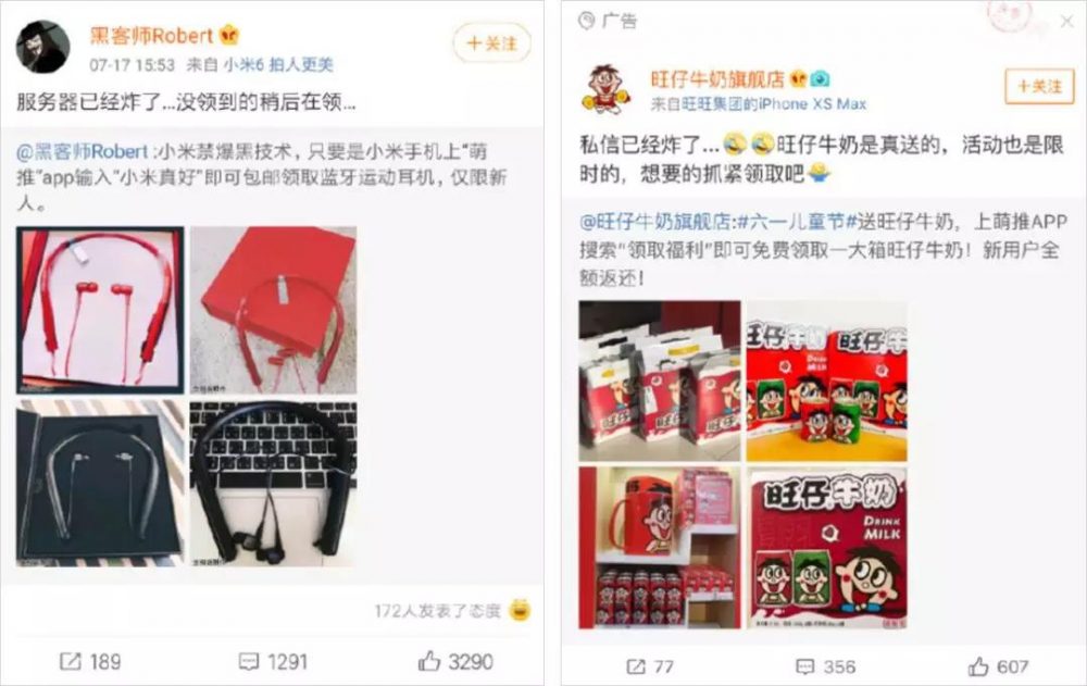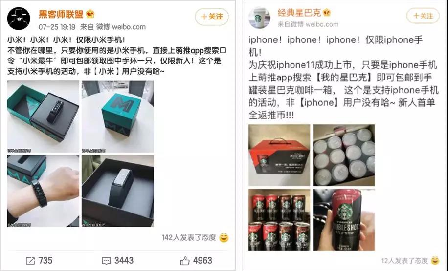 微博、抖音都是「萌推」广告泛滥的“重灾区”,随处可见免费送、不要钱、全额返的吸睛广告语,还有各种知名大V 比如星巴克、海底捞等都在帮忙做推广。