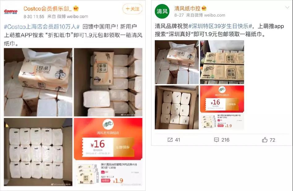 比如前段时间 Costco 在上海开业的时候,「萌推」冒充 Costco 官方账号做活动,还美其名曰回馈用户;在深圳特区 39 周年的时候,它还冒充清风纸巾官方账号送祝福,做推广。