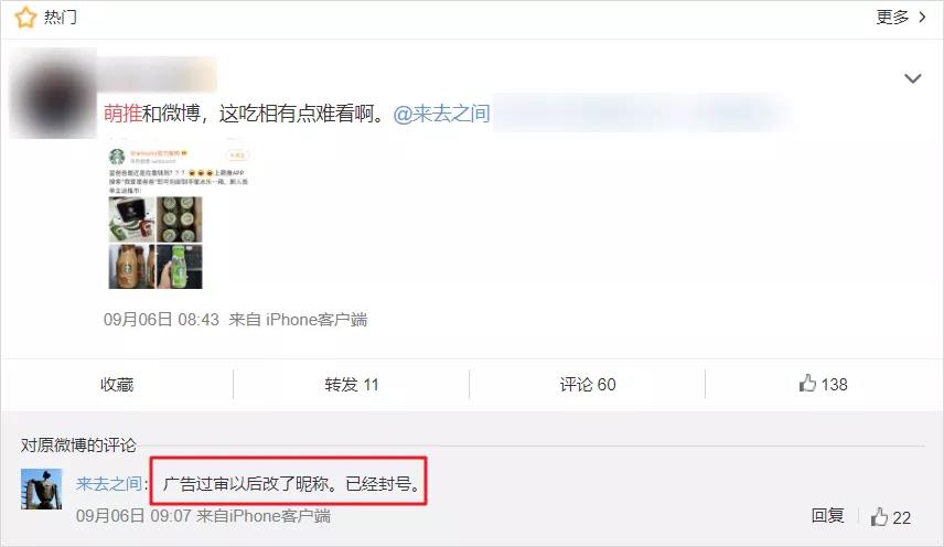 真是把用户当猴耍。有用户质疑为什么虚假广告在微博上可以过审,微博 CEO@来去之间 解释说,「萌推」用未更改昵称的账号发布广告信息,等广告通过审核再把昵称了。