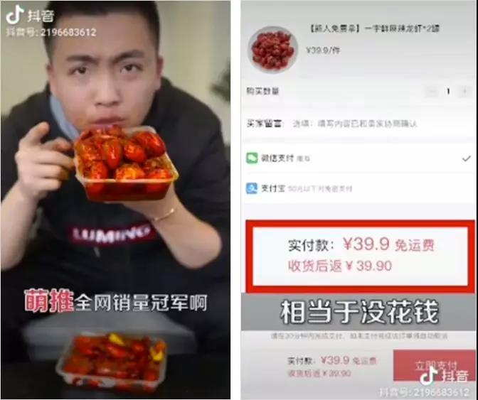 小龙虾尾实际付款 39.9 免运费,收货后返 39.90,相当于没花钱……