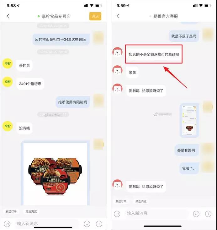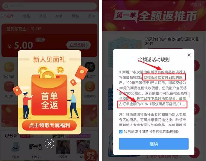 表面上看,购物全额返推币,推币还能抵钱花,没啥毛病。实际上,等你用「推币」抵钱的时候,就有各种问题出现: