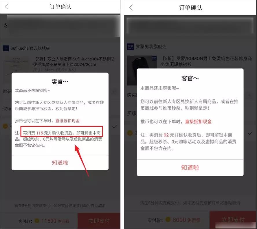 更狠的来了,有的商品还不能用推币抵扣,得再消费 XX 元才能解锁。