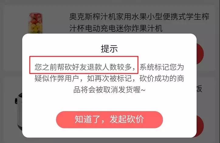 可笑的是,你砍价成功的商品也可能会被商家取消发货,因为帮忙砍价的好友退款人数多,系统标记疑似作弊用户。