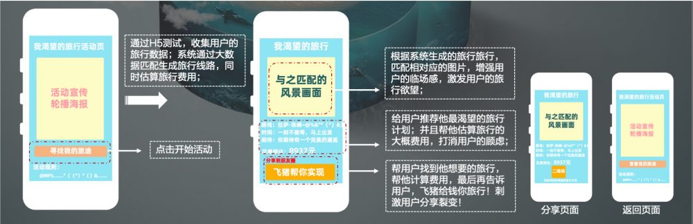 流量越来越贵,推广成本太高,投入资源开发H5,在微信进行活动宣传;针对用户普遍没有明确的旅行目的,没钱旅行的现状,以#测试你的旅行人格 —#推荐你的旅行路线 —#估算你的旅途费用 —#实现你的旅行愿望为主线开发H5;H5测试类似调查问卷,收集用户想去哪?什么时候?和谁?怎么去?为什么去?去做什么?引导用户做选择题,锁定需求。