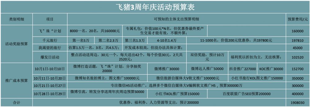 此飞猪周年庆活动策划案整体流程分为三大模块进行:基础信息、核心内容、活动执行。由于活动方案未落地,活动总结和复盘不在此进行讨论。