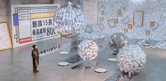 去年魅族为双12造势的时候,就设计了一款小广告,结合孟菲斯风格,宣传降价信息,甚至请到艺术家许仲敏,做了一场装置艺术展。
