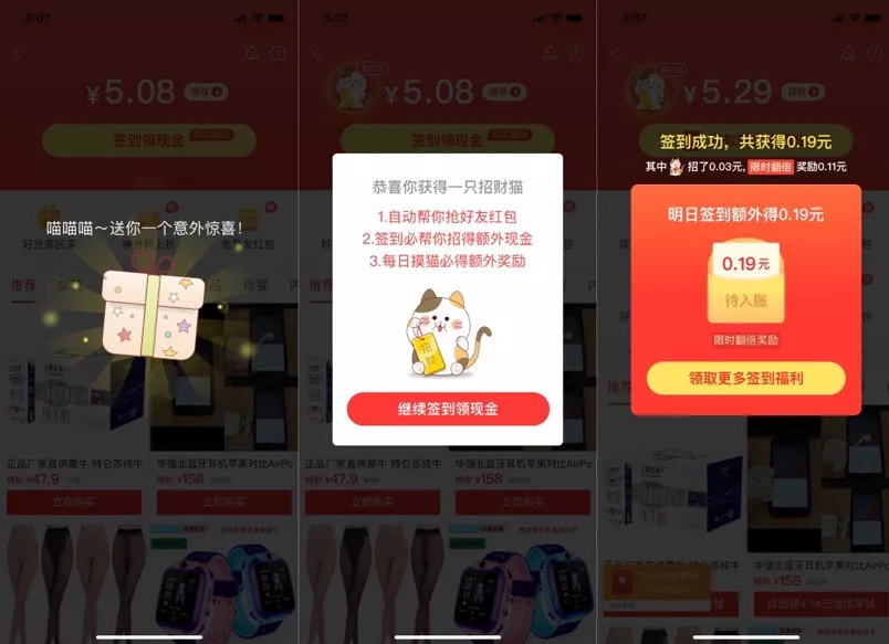 现金签到时,随机弹出隐藏活动:招财猫—点击获得额外奖励—签到后点击招财猫浮标—做任务(签到、好友互动、下单)等增加猫活跃的时长;
